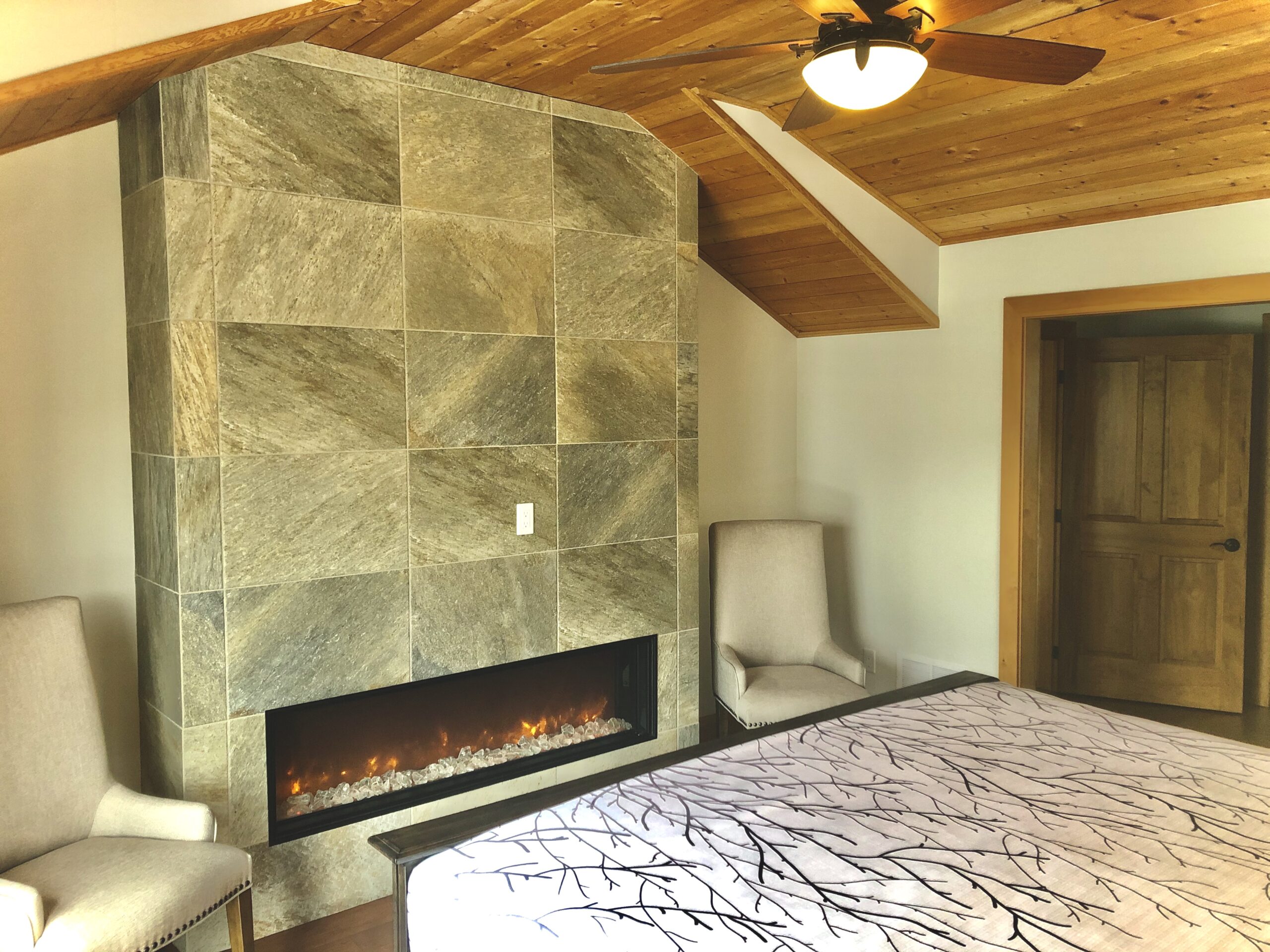 - King bed in master bedroom with fireplace, walkout to private balcony